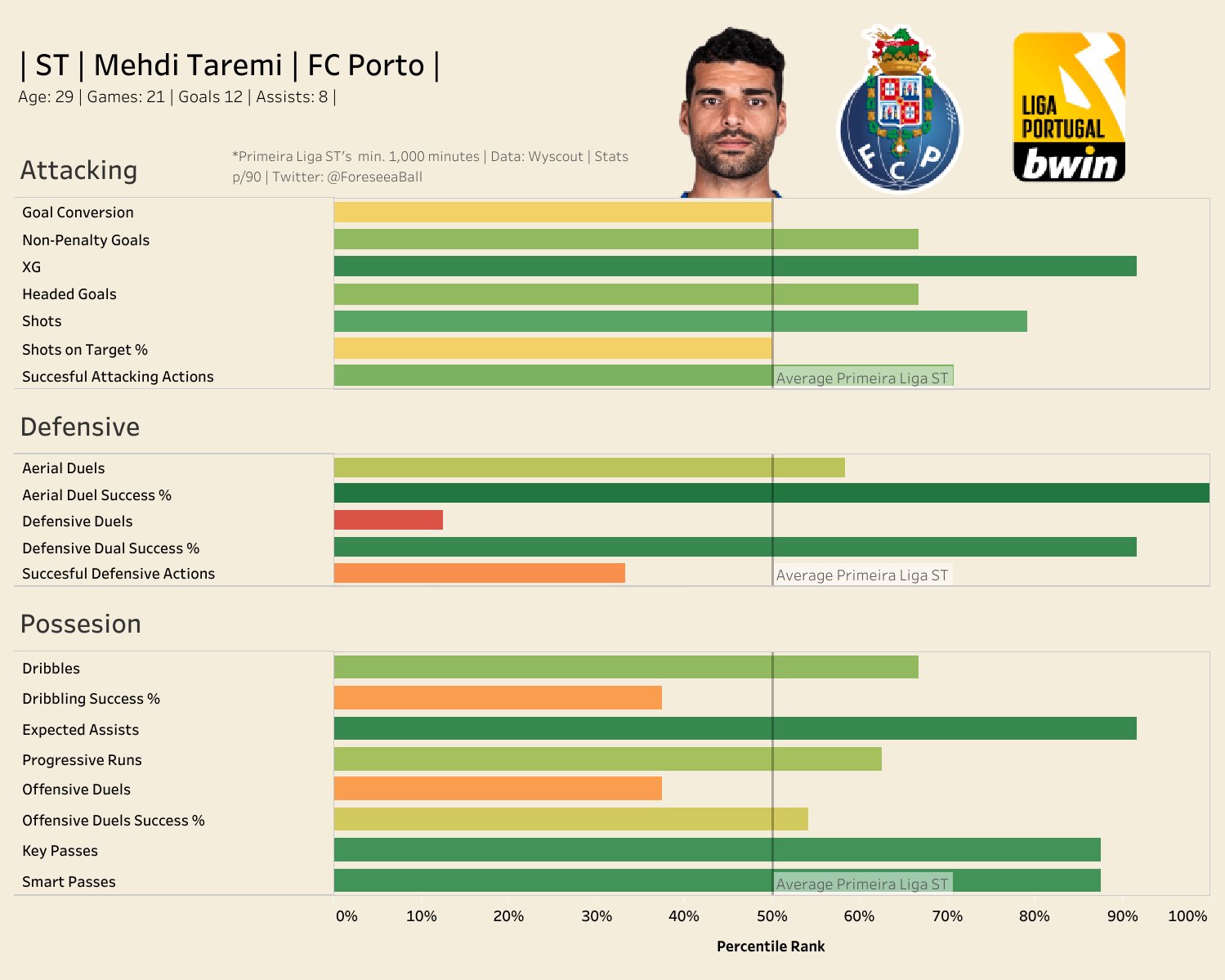 Dang, he is on fire! We all sensed it already, but it's nice to see it in actual numbers. His relevant attacking stats are way above average for the league, and his defensive success (particularly aerial duels) as well as assisting are very noteworthy for a striker.