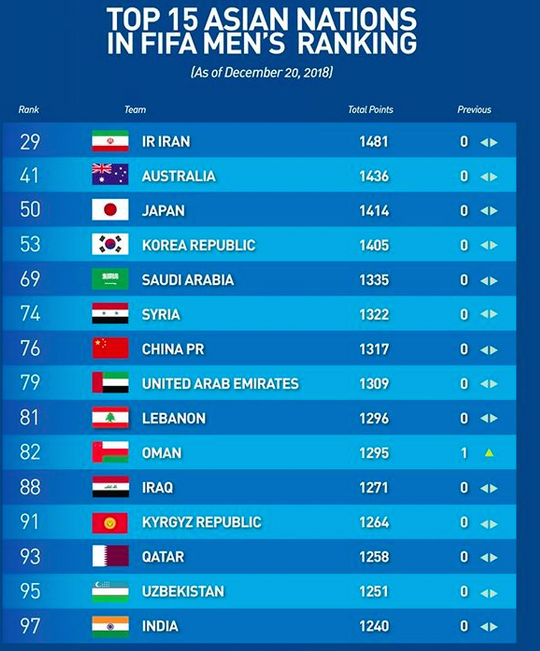 Team Melli retained their position in 29th spot, with Australia, Japan, Korea Republic and Saudi Arabia’s positions also unchanged at 29th, 41st, 50th, 53rd, and 69th respectively to complete Asia’s top five.